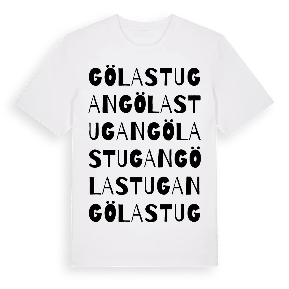 Gölastugan ordlek t-shirt är inspirerad av Gölastugan i Södermanlands län, Sverige. Tröjan är designad för dig som har en speciell koppling till platsen – oavsett om du bor här, har rötterna här eller bara älskar Gölastugan.