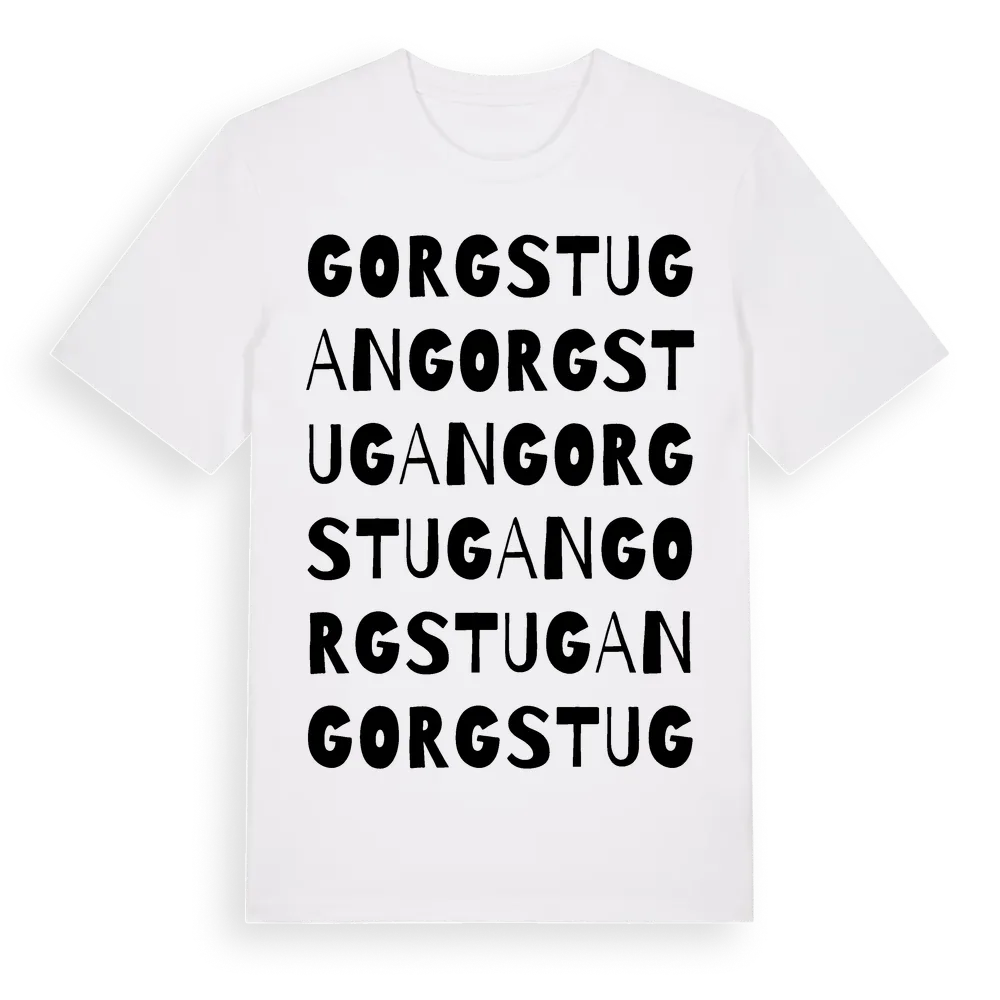 Gorgstugan ordlek t-shirt är inspirerad av Gorgstugan i Södermanlands län, Sverige. Tröjan är designad för dig som har en speciell koppling till platsen – oavsett om du bor här, har rötterna här eller bara älskar Gorgstugan.