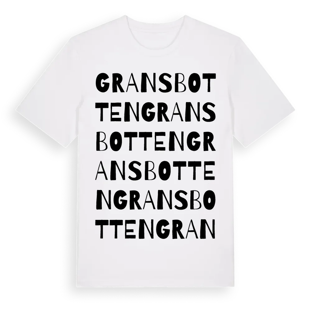 Gransbotten ordlek t-shirt är inspirerad av Gransbotten i Södermanlands län, Sverige. Tröjan är designad för dig som har en speciell koppling till platsen – oavsett om du bor här, har rötterna här eller bara älskar Gransbotten.