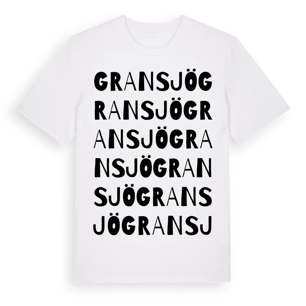 Gransjö ordlek t-shirt är inspirerad av Gransjö i Södermanlands län, Sverige. Tröjan är designad för dig som har en speciell koppling till platsen – oavsett om du bor här, har rötterna här eller bara älskar Gransjö.