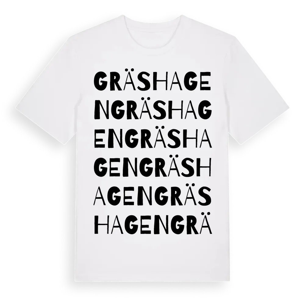 Gräshagen ordlek t-shirt är inspirerad av Gräshagen i Södermanlands län, Sverige. Tröjan är designad för dig som har en speciell koppling till platsen – oavsett om du bor här, har rötterna här eller bara älskar Gräshagen.