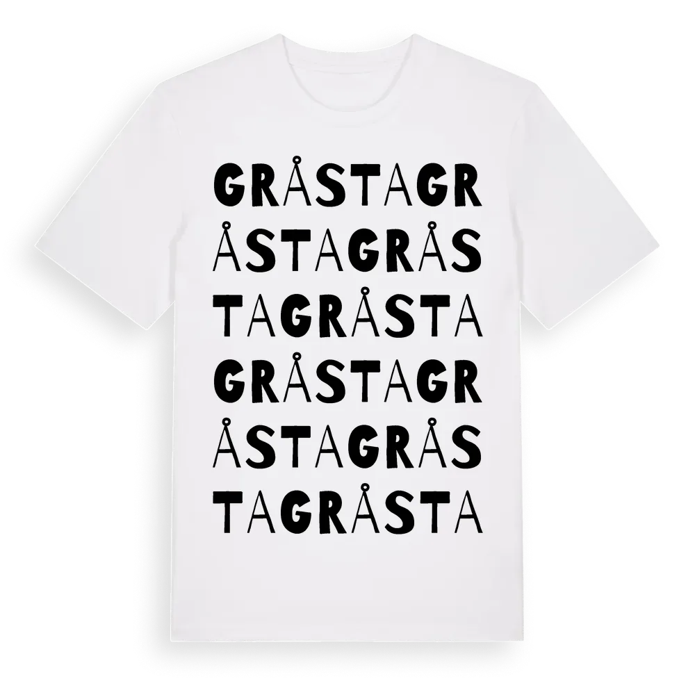 En ordlek byggd på Gråstas namn. Subtilt och klurig – ett motiv som bara de som verkligen känner platsen fullt ut förstår. Premium bomull, unisex – från Gråsta i Södermanlands län.