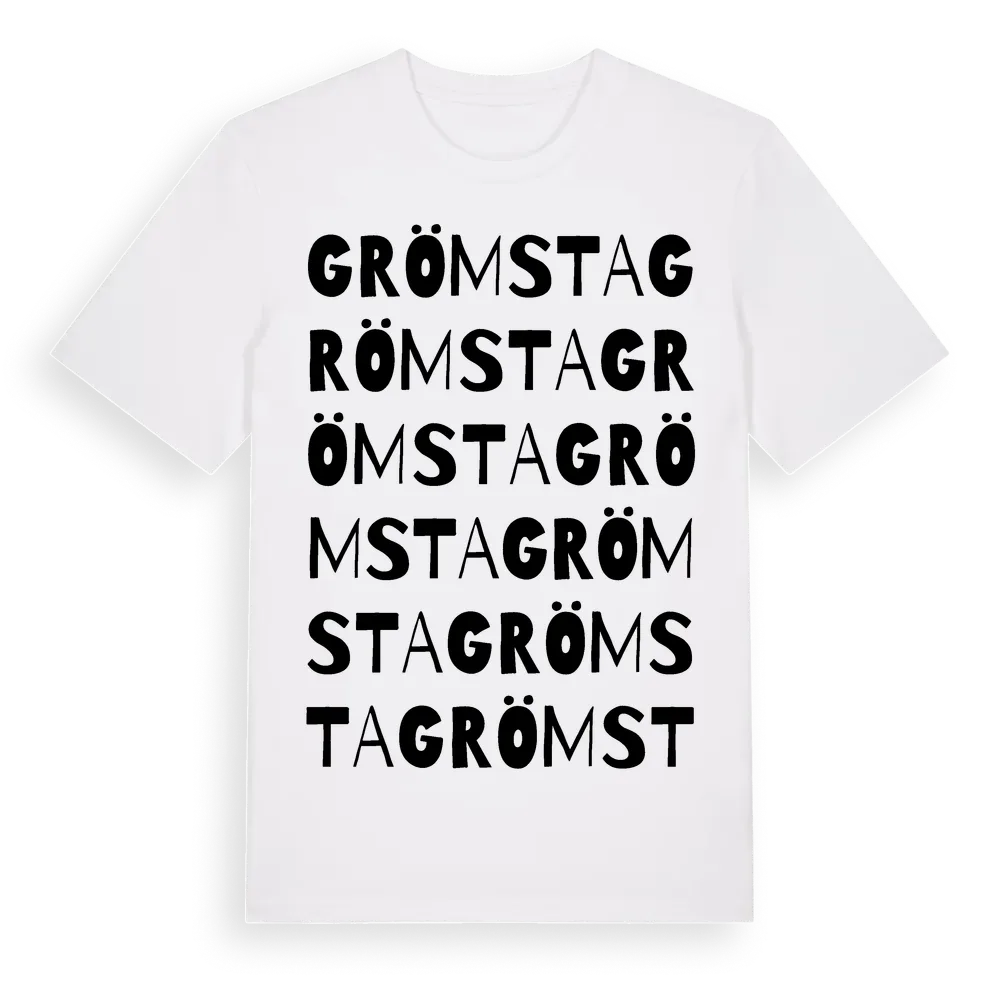 Grömsta ordlek t-shirt är inspirerad av Grömsta i Södermanlands län, Sverige. Tröjan är designad för dig som har en speciell koppling till platsen – oavsett om du bor här, har rötterna här eller bara älskar Grömsta.