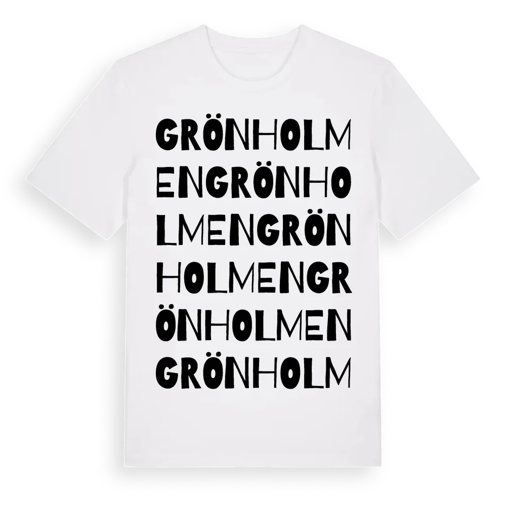 Grönholmen ordlek t-shirt är inspirerad av Grönholmen i Södermanlands län, Sverige. Tröjan är designad för dig som har en speciell koppling till platsen – oavsett om du bor här, har rötterna här eller bara älskar Grönholmen.