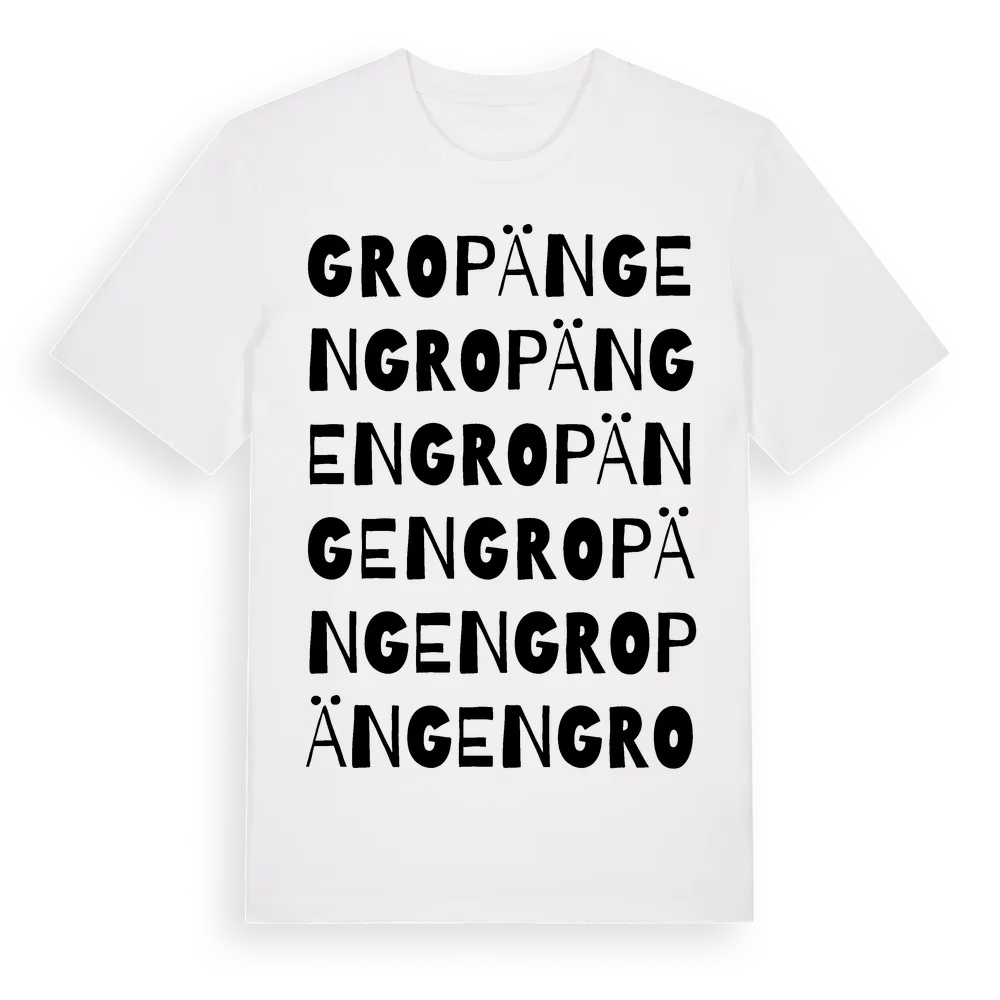 Gropängen ordlek t-shirt är inspirerad av Gropängen i Södermanlands län, Sverige. Tröjan är designad för dig som har en speciell koppling till platsen – oavsett om du bor här, har rötterna här eller bara älskar Gropängen.