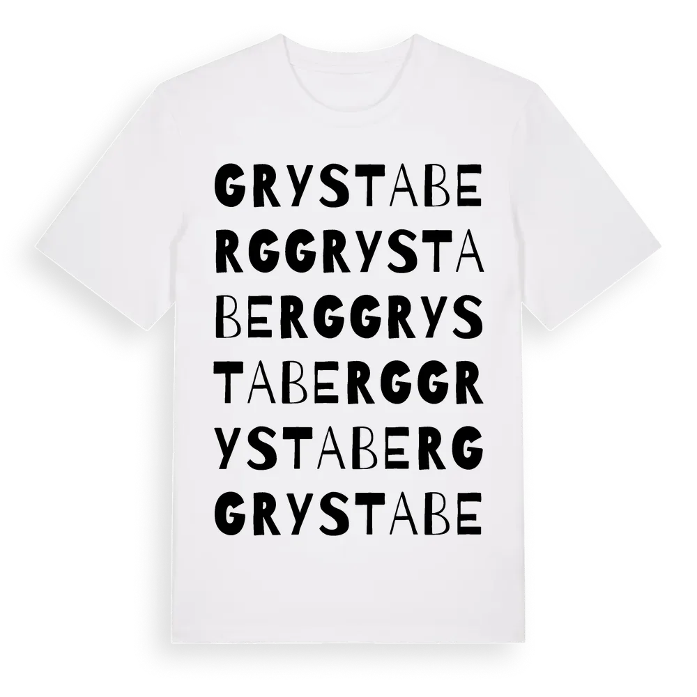 Grystaberg ordlek t-shirt är inspirerad av Grystaberg i Södermanlands län, Sverige. Tröjan är designad för dig som har en speciell koppling till platsen – oavsett om du bor här, har rötterna här eller bara älskar Grystaberg.