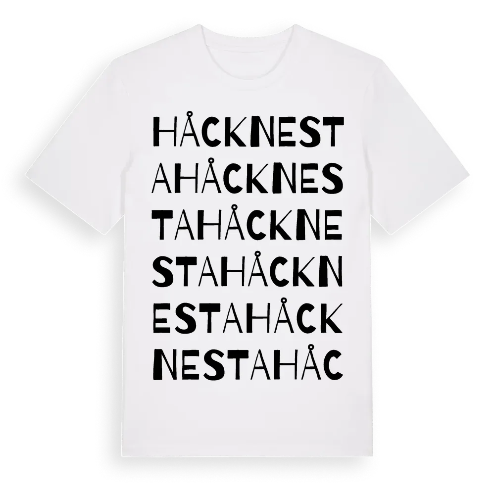 Håcknesta ordlek t-shirt är inspirerad av byn Håcknesta i Södermanlands län, Sverige. Tröjan är designad för dig som har en speciell koppling till platsen – oavsett om du bor här, har rötterna här eller bara älskar Håcknesta.