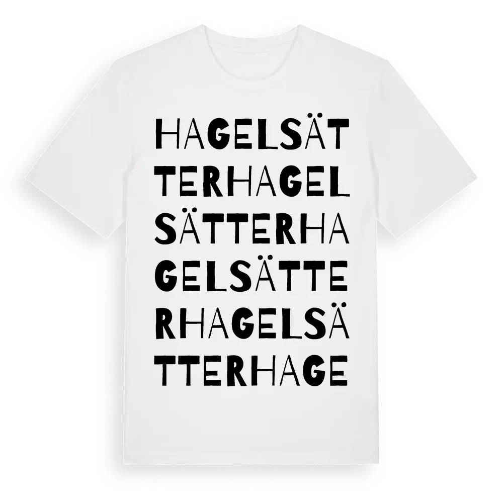 Hagelsätter ordlek t-shirt är inspirerad av Hagelsätter i Södermanlands län, Sverige. Tröjan är designad för dig som har en speciell koppling till platsen – oavsett om du bor här, har rötterna här eller bara älskar Hagelsätter.