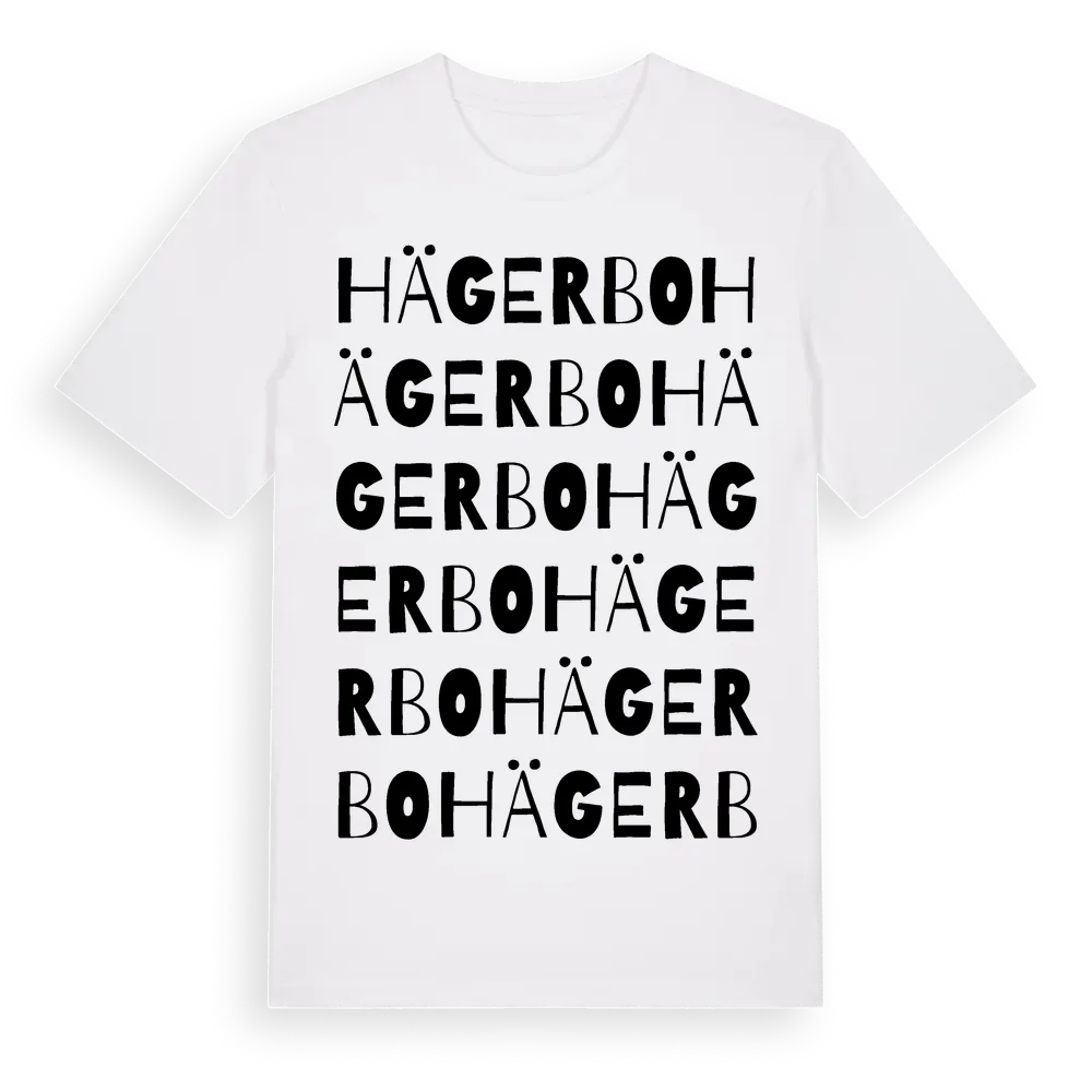 Hägerbo ordlek t-shirt är inspirerad av Hägerbo i Södermanlands län, Sverige. Tröjan är designad för dig som har en speciell koppling till platsen – oavsett om du bor här, har rötterna här eller bara älskar Hägerbo.