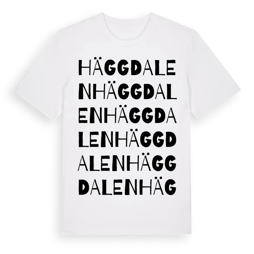 Häggdalen ordlek t-shirt är inspirerad av Häggdalen i Södermanlands län, Sverige. Tröjan är designad för dig som har en speciell koppling till platsen – oavsett om du bor här, har rötterna här eller bara älskar Häggdalen.