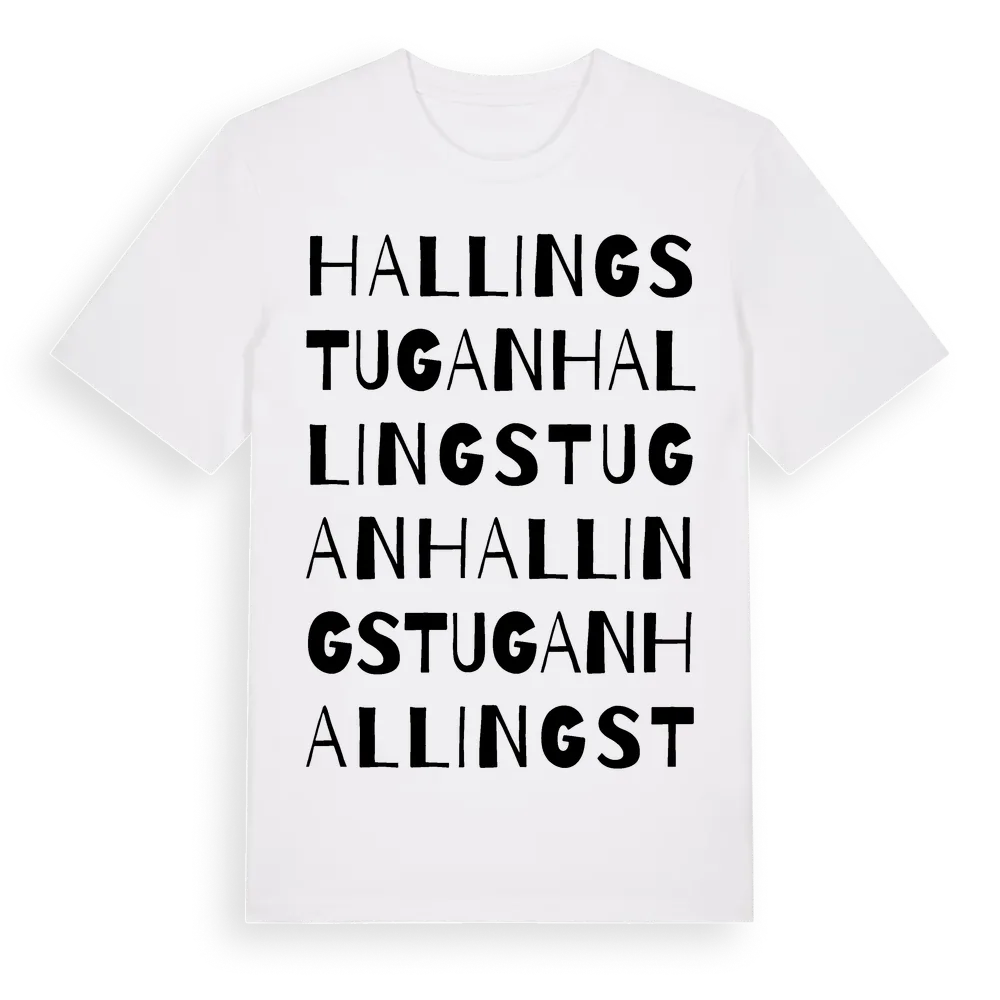 Hallingstugan ordlek t-shirt är inspirerad av Hallingstugan i Södermanlands län, Sverige. Tröjan är designad för dig som har en speciell koppling till platsen – oavsett om du bor här, har rötterna här eller bara älskar Hallingstugan.