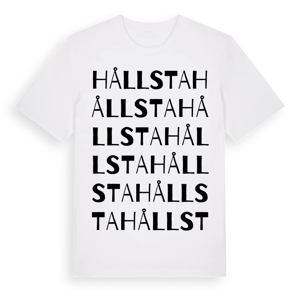 En ordlek byggd på Hållstas namn. Subtilt och klurig – ett motiv som bara de som verkligen känner platsen fullt ut förstår. Premium bomull, unisex – från Hållsta i Södermanlands län.