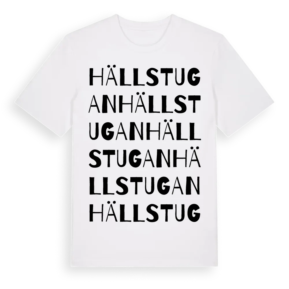 En ordlek byggd på Hällstugans namn. Subtilt och klurig – ett motiv som bara de som verkligen känner platsen fullt ut förstår. Premium bomull, unisex – från Hällstugan i Södermanlands län.