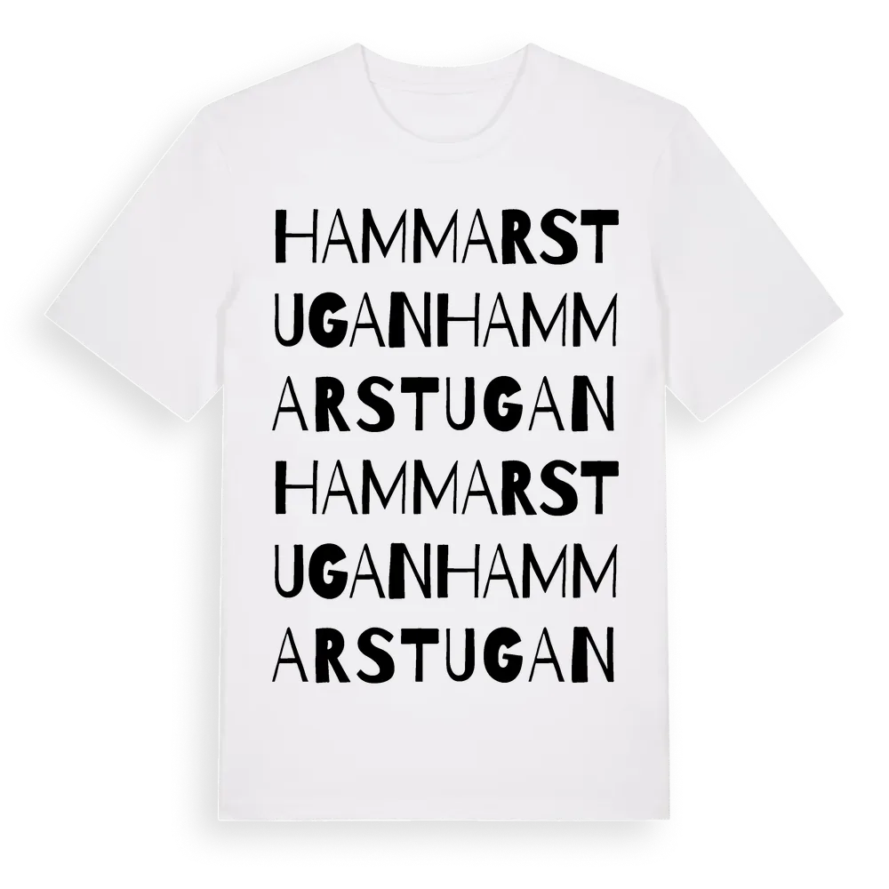 En ordlek byggd på Hammarstugans namn. Subtilt och klurig – ett motiv som bara de som verkligen känner platsen fullt ut förstår. Premium bomull, unisex – från Hammarstugan i Södermanlands län.