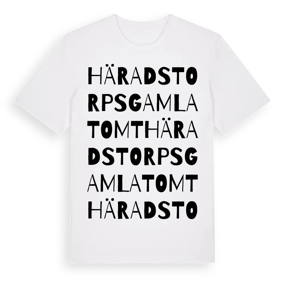 Häradstorps Gamla Tomt ordlek t-shirt är inspirerad av Häradstorps Gamla Tomt i Södermanlands län, Sverige. Tröjan är designad för dig som har en speciell koppling till platsen – oavsett om du bor här, har rötterna här eller bara älskar Häradstorps Gamla Tomt.