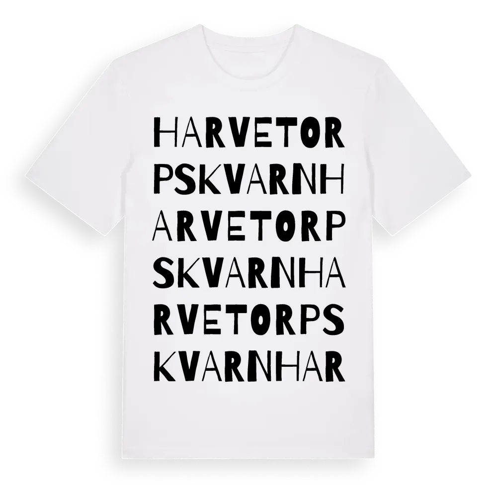 Harvetorps Kvarn ordlek t-shirt är inspirerad av Harvetorps Kvarn i Södermanlands län, Sverige. Tröjan är designad för dig som har en speciell koppling till platsen – oavsett om du bor här, har rötterna här eller bara älskar Harvetorps Kvarn.