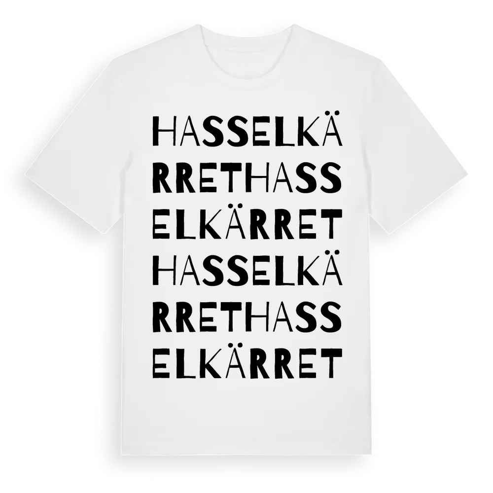 Hasselkärret ordlek t-shirt är inspirerad av Hasselkärret i Södermanlands län, Sverige. Tröjan är designad för dig som har en speciell koppling till platsen – oavsett om du bor här, har rötterna här eller bara älskar Hasselkärret.