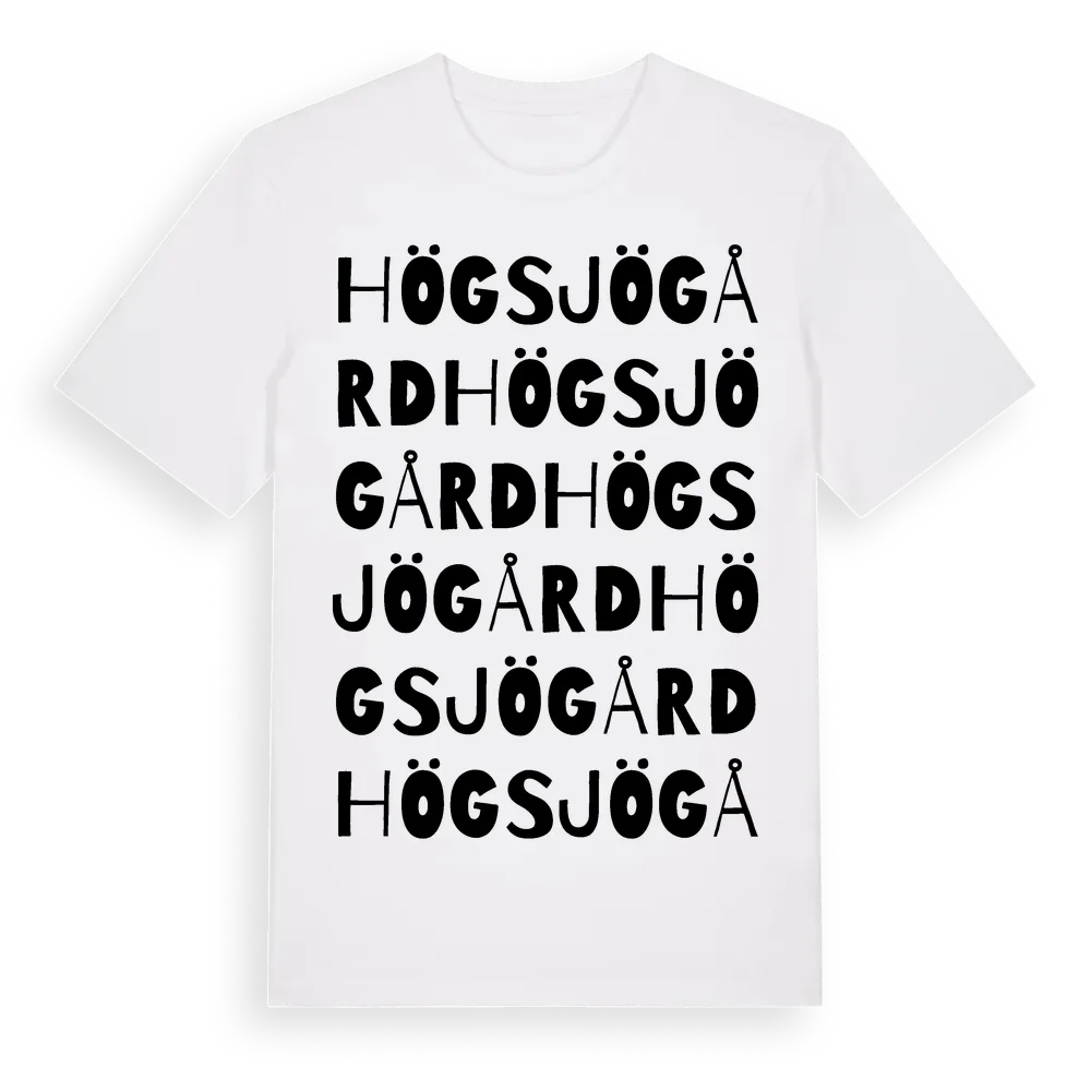 Högsjö Gård ordlek t-shirt är inspirerad av Högsjö Gård i Södermanlands län, Sverige. Tröjan är designad för dig som har en speciell koppling till platsen – oavsett om du bor här, har rötterna här eller bara älskar Högsjö Gård.