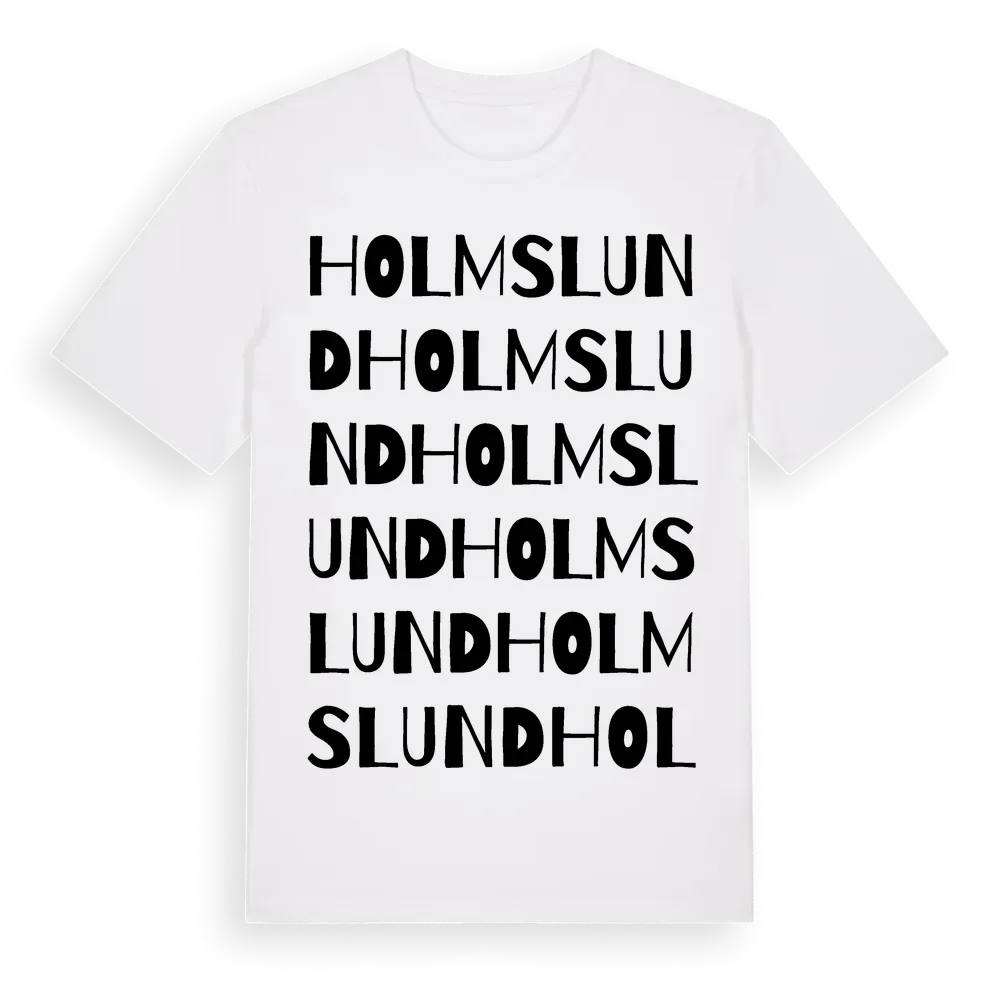Holmslund ordlek t-shirt är inspirerad av Holmslund i Södermanlands län, Sverige. Tröjan är designad för dig som har en speciell koppling till platsen – oavsett om du bor här, har rötterna här eller bara älskar Holmslund.