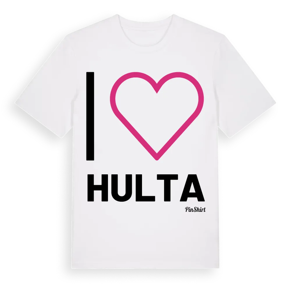 Jag älskar Hulta t-shirt stort tryck är inspirerad av byn Hulta i Södermanlands län, Sverige. Tröjan är designad för dig som har en speciell koppling till platsen – oavsett om du bor här, har rötterna här eller bara älskar Hulta.