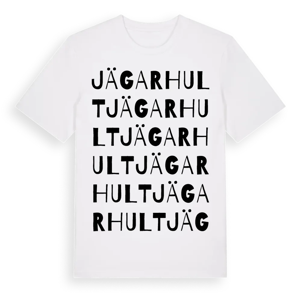 Jägarhult ordlek t-shirt är inspirerad av Jägarhult i Södermanlands län, Sverige. Tröjan är designad för dig som har en speciell koppling till platsen – oavsett om du bor här, har rötterna här eller bara älskar Jägarhult.