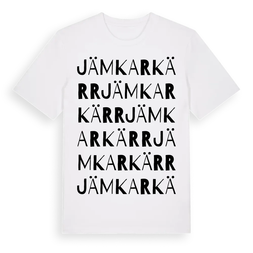Jämkarkärr ordlek t-shirt är inspirerad av Jämkarkärr i Södermanlands län, Sverige. Tröjan är designad för dig som har en speciell koppling till platsen – oavsett om du bor här, har rötterna här eller bara älskar Jämkarkärr.