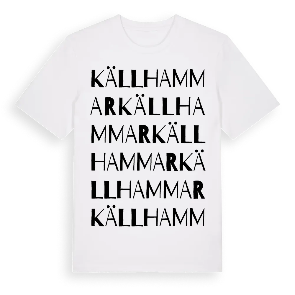Källhammar ordlek t-shirt är inspirerad av stadsdelen Källhammar i Södermanlands län, Sverige. Tröjan är designad för dig som har en speciell koppling till platsen – oavsett om du bor här, har rötterna här eller bara älskar Källhammar.