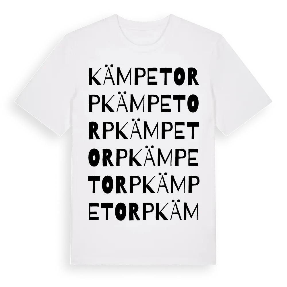 Kämpetorp ordlek t-shirt är inspirerad av Kämpetorp i Södermanlands län, Sverige. Tröjan är designad för dig som har en speciell koppling till platsen – oavsett om du bor här, har rötterna här eller bara älskar Kämpetorp.