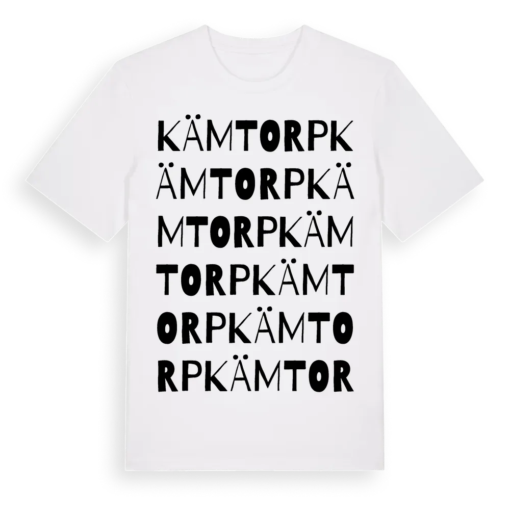 Kämtorp ordlek t-shirt är inspirerad av Kämtorp i Södermanlands län, Sverige. Tröjan är designad för dig som har en speciell koppling till platsen – oavsett om du bor här, har rötterna här eller bara älskar Kämtorp.