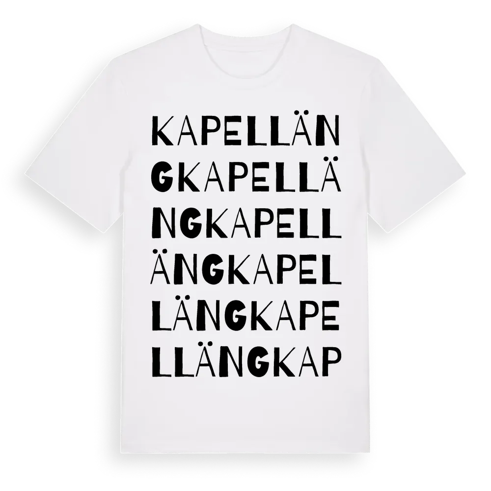 Kapelläng ordlek t-shirt är inspirerad av Kapelläng i Södermanlands län, Sverige. Tröjan är designad för dig som har en speciell koppling till platsen – oavsett om du bor här, har rötterna här eller bara älskar Kapelläng.