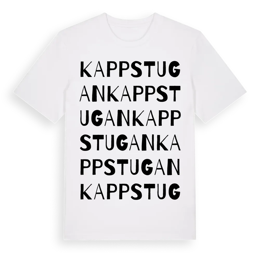 Kappstugan ordlek t-shirt är inspirerad av Kappstugan i Södermanlands län, Sverige. Tröjan är designad för dig som har en speciell koppling till platsen – oavsett om du bor här, har rötterna här eller bara älskar Kappstugan.