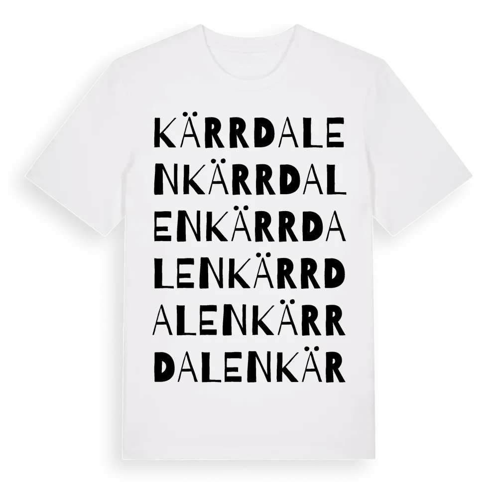 Kärrdalen ordlek t-shirt är inspirerad av Kärrdalen i Södermanlands län, Sverige. Tröjan är designad för dig som har en speciell koppling till platsen – oavsett om du bor här, har rötterna här eller bara älskar Kärrdalen.