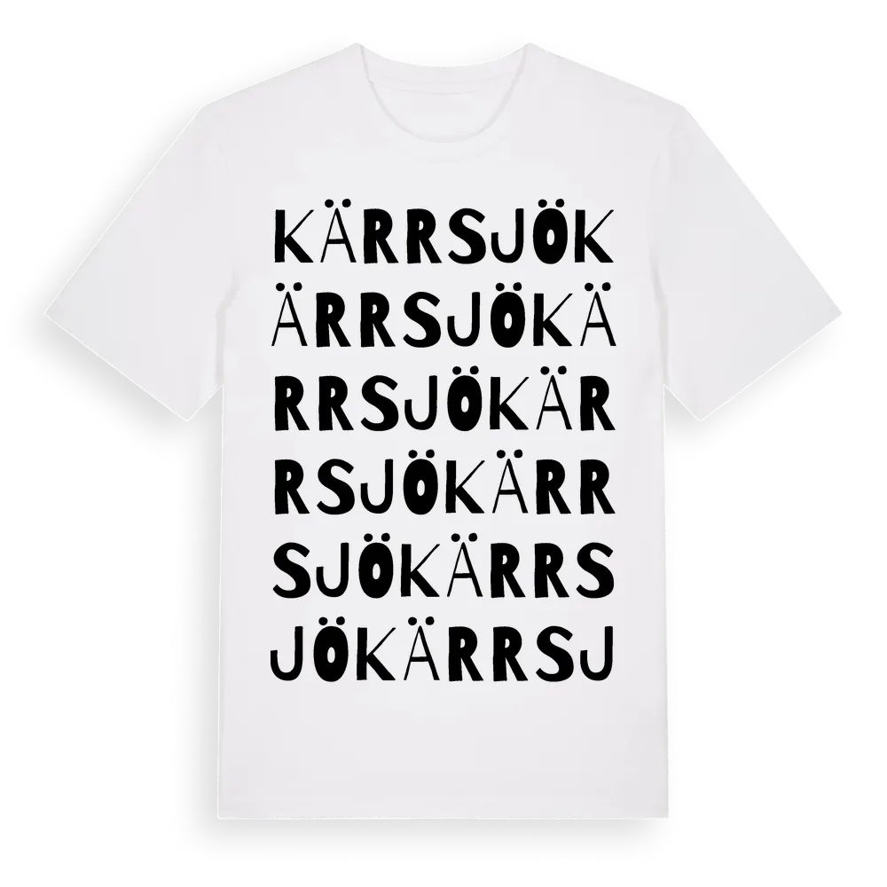 Kärrsjö ordlek t-shirt är inspirerad av Kärrsjö i Södermanlands län, Sverige. Tröjan är designad för dig som har en speciell koppling till platsen – oavsett om du bor här, har rötterna här eller bara älskar Kärrsjö.