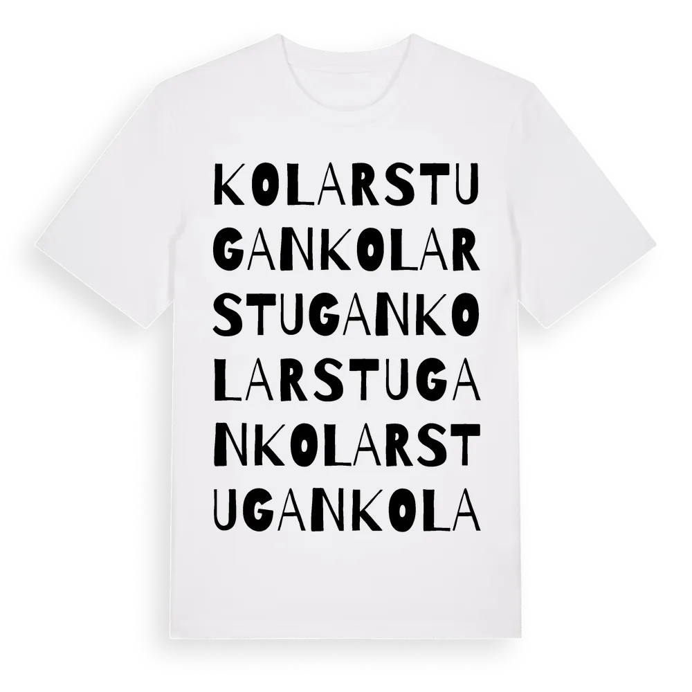 Kolarstugan ordlek t-shirt är inspirerad av Kolarstugan i Södermanlands län, Sverige. Tröjan är designad för dig som har en speciell koppling till platsen – oavsett om du bor här, har rötterna här eller bara älskar Kolarstugan.