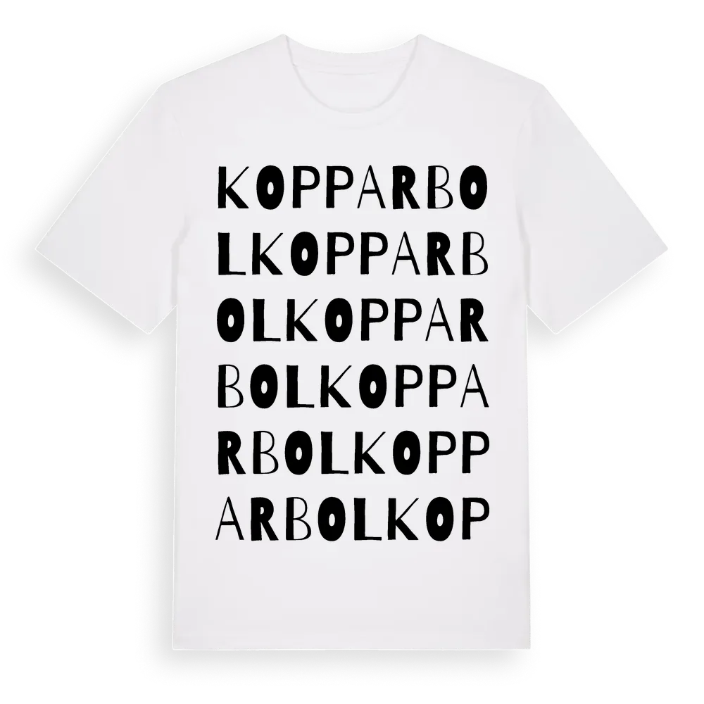 Kopparbol ordlek t-shirt är inspirerad av Kopparbol i Södermanlands län, Sverige. Tröjan är designad för dig som har en speciell koppling till platsen – oavsett om du bor här, har rötterna här eller bara älskar Kopparbol.