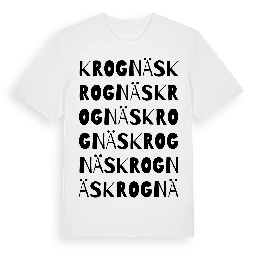 Krognäs ordlek t-shirt är inspirerad av Krognäs i Södermanlands län, Sverige. Tröjan är designad för dig som har en speciell koppling till platsen – oavsett om du bor här, har rötterna här eller bara älskar Krognäs.