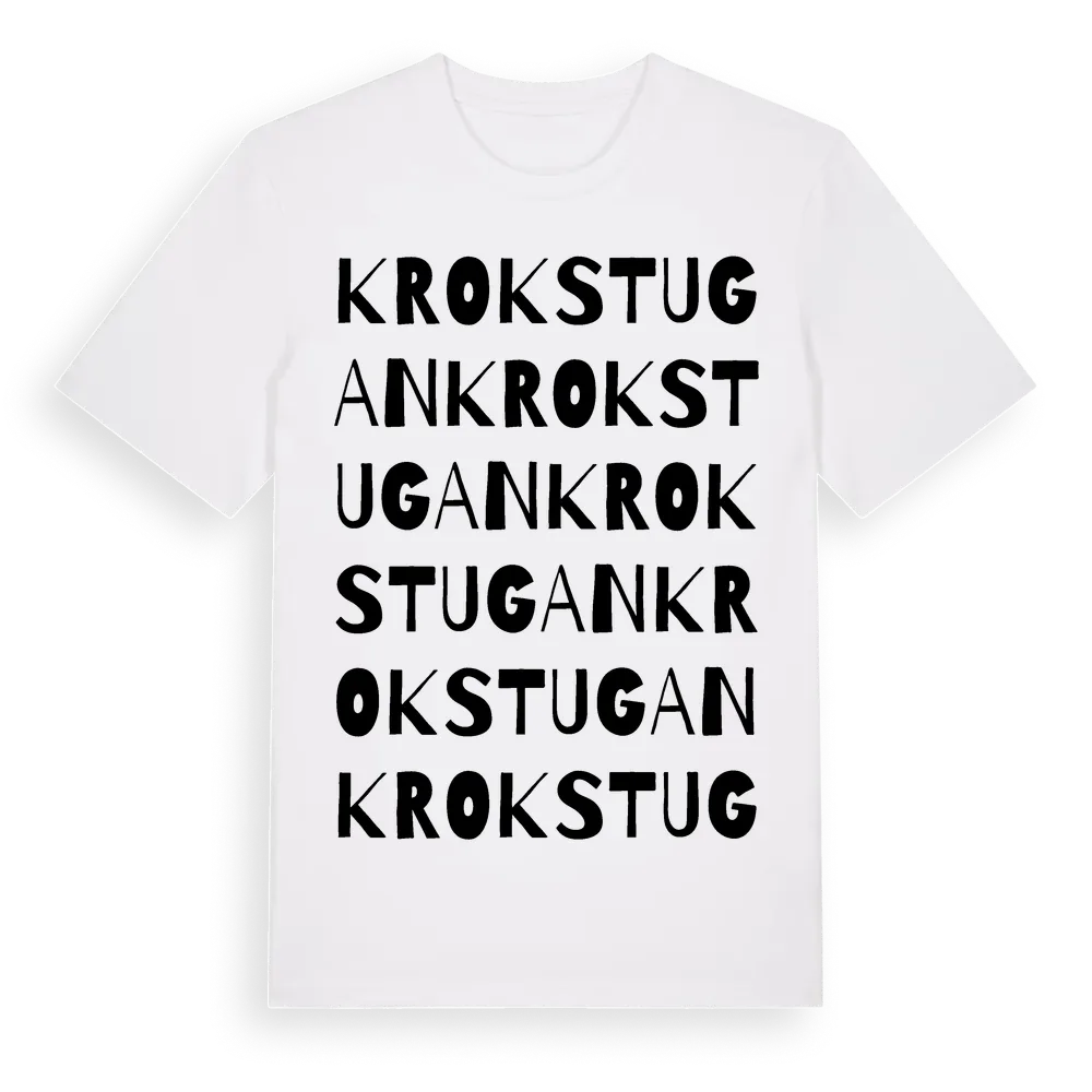 Krokstugan ordlek t-shirt är inspirerad av Krokstugan i Södermanlands län, Sverige. Tröjan är designad för dig som har en speciell koppling till platsen – oavsett om du bor här, har rötterna här eller bara älskar Krokstugan.