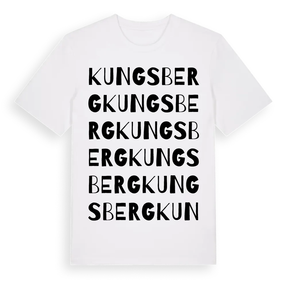 Kungsberg ordlek t-shirt är inspirerad av byn Kungsberg i Södermanlands län, Sverige. Tröjan är designad för dig som har en speciell koppling till platsen – oavsett om du bor här, har rötterna här eller bara älskar Kungsberg.
