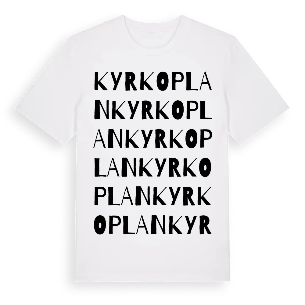 Kyrkoplan ordlek t-shirt är inspirerad av Kyrkoplan i Södermanlands län, Sverige. Tröjan är designad för dig som har en speciell koppling till platsen – oavsett om du bor här, har rötterna här eller bara älskar Kyrkoplan.