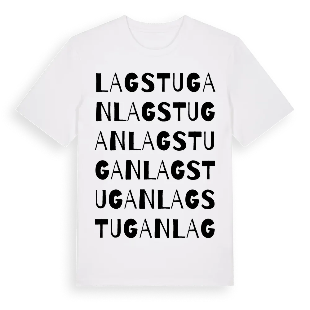 Lagstugan ordlek t-shirt är inspirerad av Lagstugan i Södermanlands län, Sverige. Tröjan är designad för dig som har en speciell koppling till platsen – oavsett om du bor här, har rötterna här eller bara älskar Lagstugan.