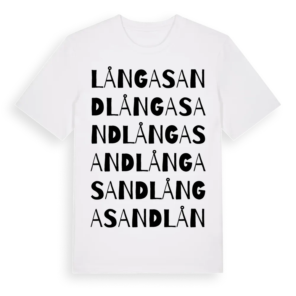 Långasand ordlek t-shirt är inspirerad av Långasand i Södermanlands län, Sverige. Tröjan är designad för dig som har en speciell koppling till platsen – oavsett om du bor här, har rötterna här eller bara älskar Långasand.