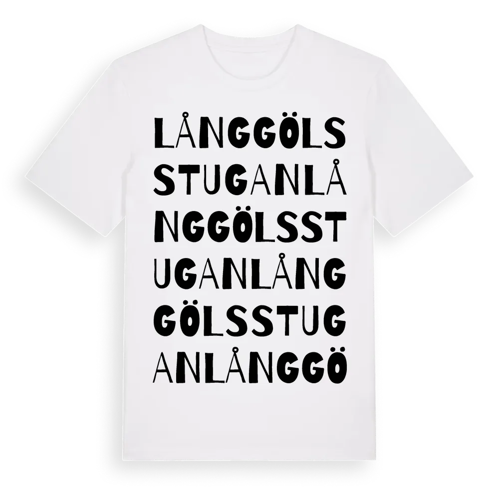 Långgölsstugan ordlek t-shirt är inspirerad av Långgölsstugan i Södermanlands län, Sverige. Tröjan är designad för dig som har en speciell koppling till platsen – oavsett om du bor här, har rötterna här eller bara älskar Långgölsstugan.