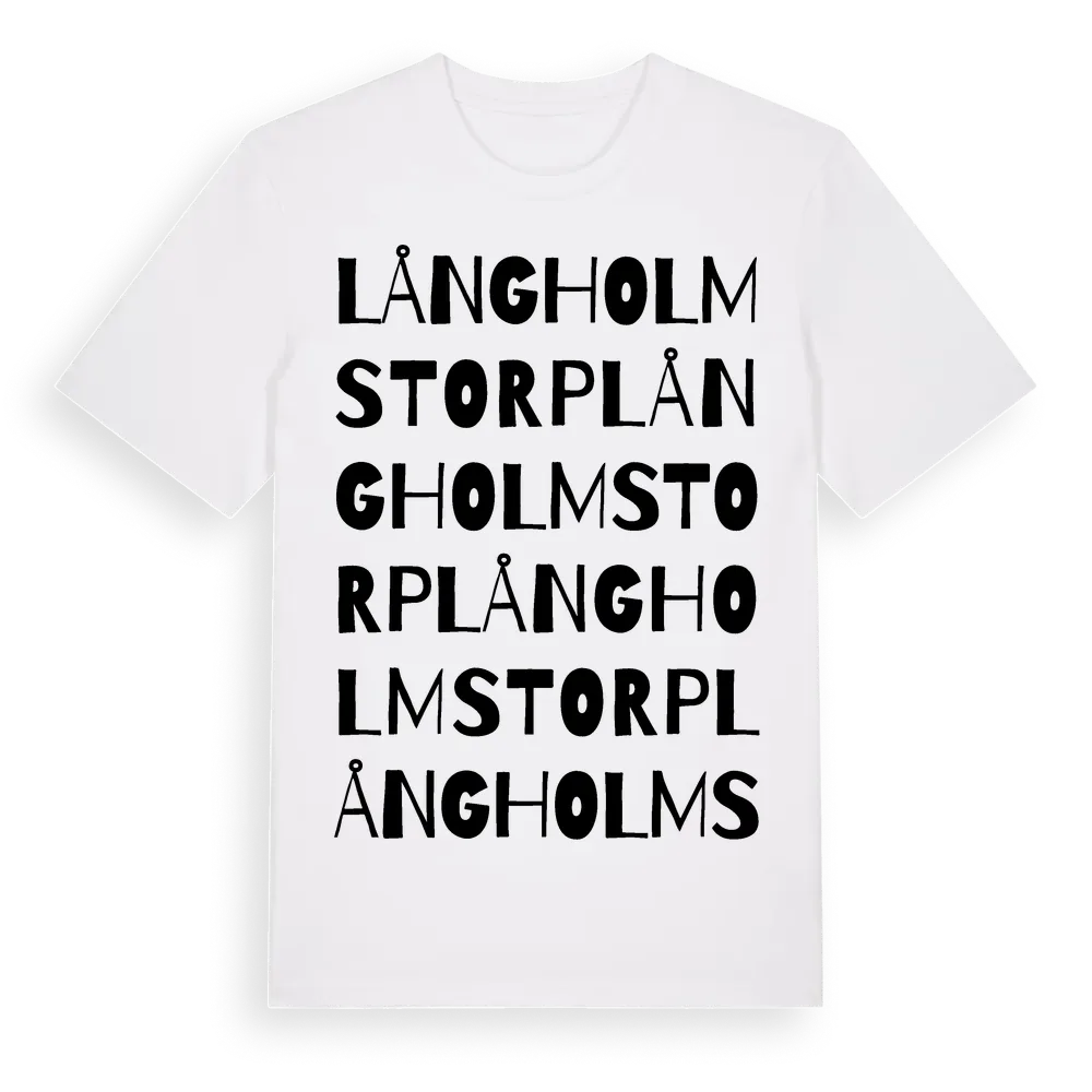 Långholmstorp ordlek t-shirt är inspirerad av Långholmstorp i Södermanlands län, Sverige. Tröjan är designad för dig som har en speciell koppling till platsen – oavsett om du bor här, har rötterna här eller bara älskar Långholmstorp.