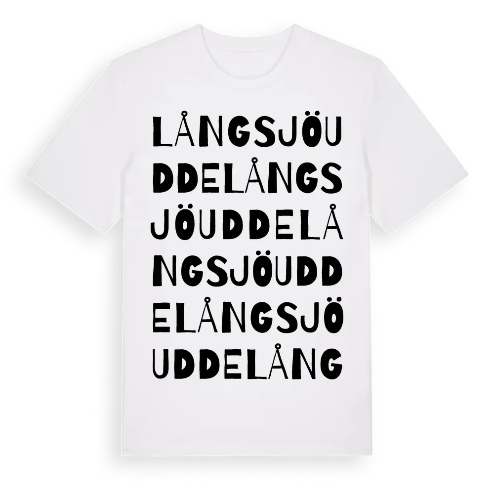 Långsjöudde ordlek t-shirt är inspirerad av Långsjöudde i Södermanlands län, Sverige. Tröjan är designad för dig som har en speciell koppling till platsen – oavsett om du bor här, har rötterna här eller bara älskar Långsjöudde.