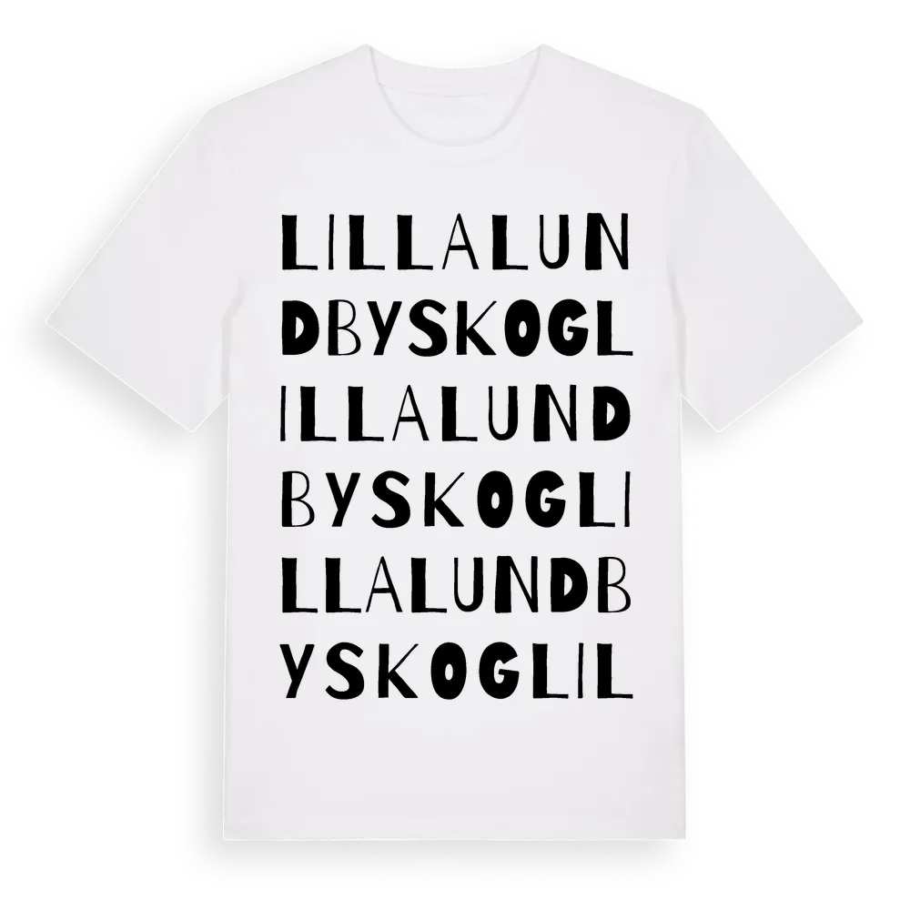 Lilla Lundbyskog ordlek t-shirt är inspirerad av byn Lilla Lundbyskog i Södermanlands län, Sverige. Tröjan är designad för dig som har en speciell koppling till platsen – oavsett om du bor här, har rötterna här eller bara älskar Lilla Lundbyskog.