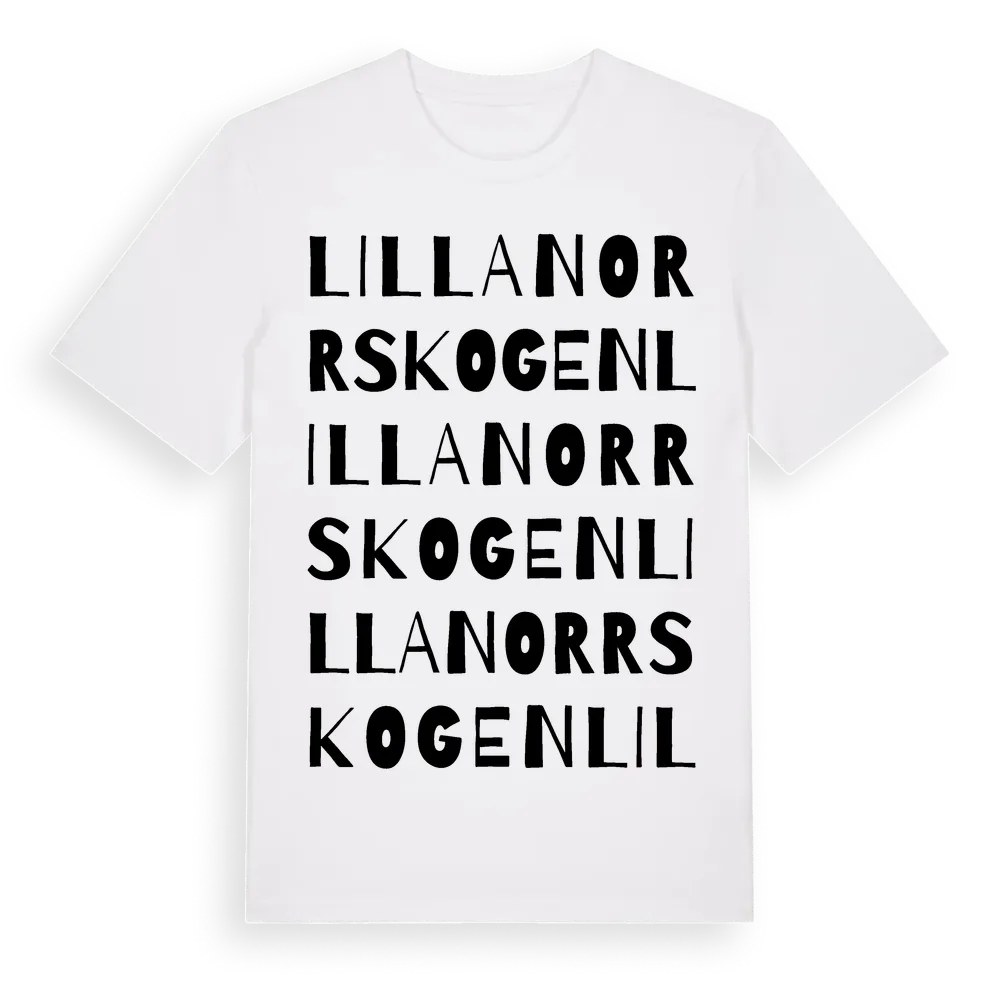 Lilla Norrskogen ordlek t-shirt är inspirerad av Lilla Norrskogen i Södermanlands län, Sverige. Tröjan är designad för dig som har en speciell koppling till platsen – oavsett om du bor här, har rötterna här eller bara älskar Lilla Norrskogen.