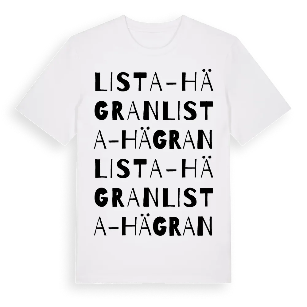 Lista-Hägran ordlek t-shirt är inspirerad av Lista-Hägran i Södermanlands län, Sverige. Tröjan är designad för dig som har en speciell koppling till platsen – oavsett om du bor här, har rötterna här eller bara älskar Lista-Hägran.