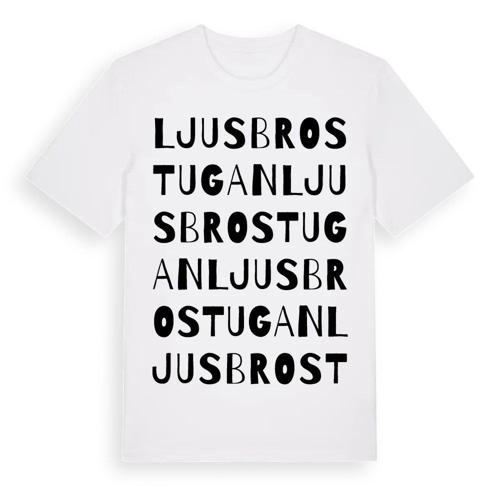 Ljusbrostugan ordlek t-shirt är inspirerad av Ljusbrostugan i Södermanlands län, Sverige. Tröjan är designad för dig som har en speciell koppling till platsen – oavsett om du bor här, har rötterna här eller bara älskar Ljusbrostugan.