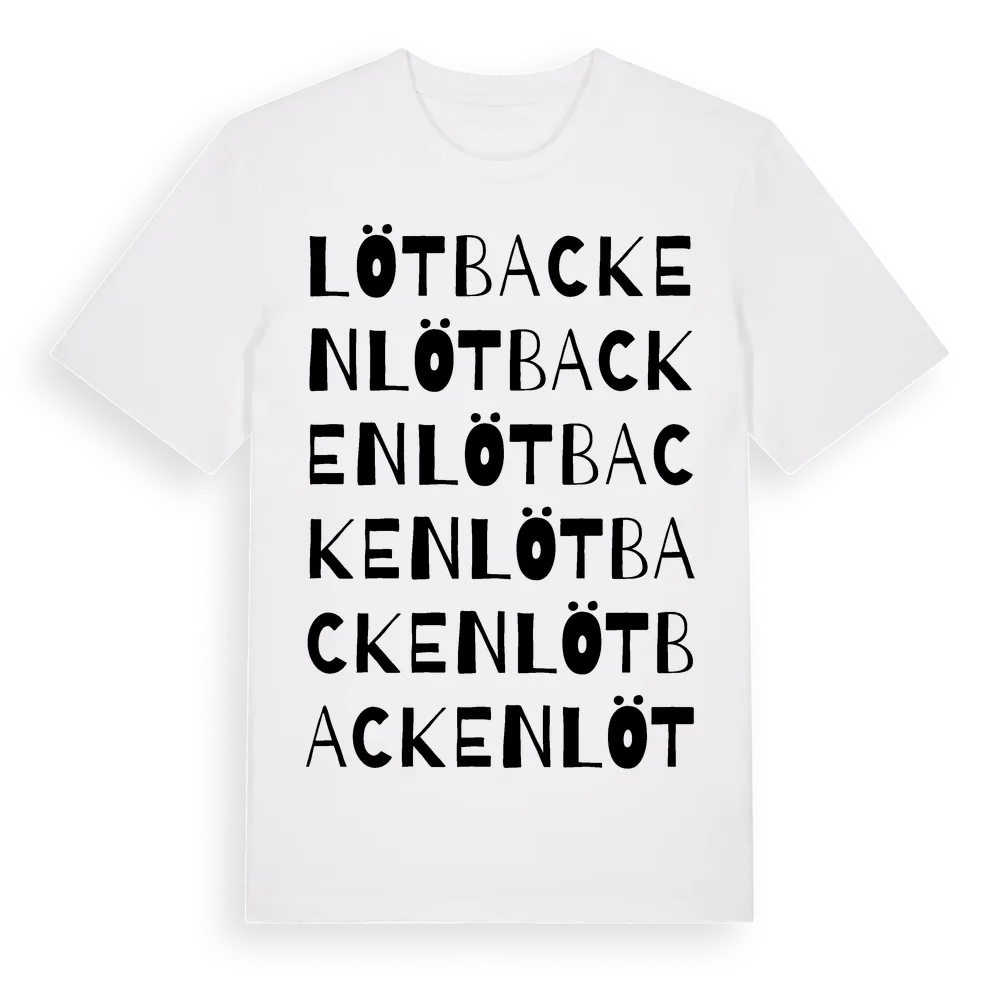 Lötbacken ordlek t-shirt är inspirerad av Lötbacken i Södermanlands län, Sverige. Tröjan är designad för dig som har en speciell koppling till platsen – oavsett om du bor här, har rötterna här eller bara älskar Lötbacken.