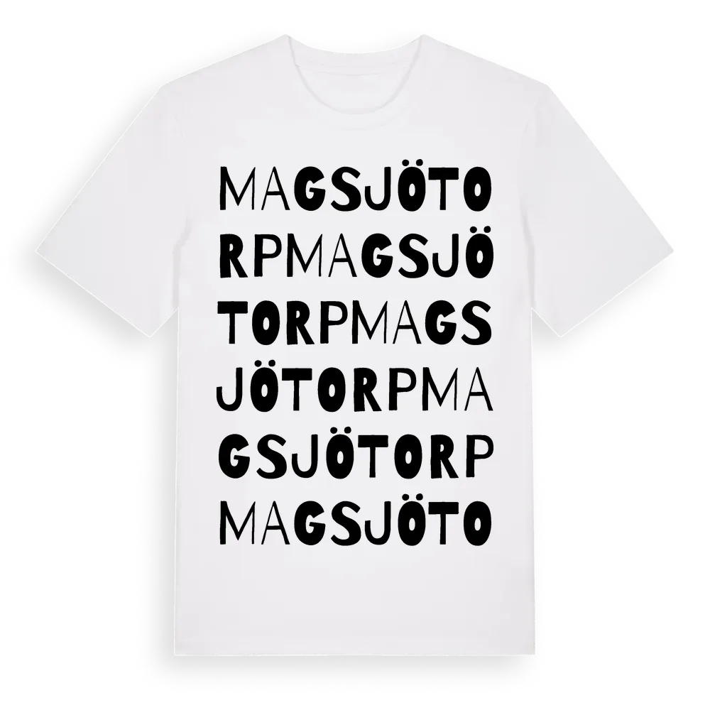 Magsjötorp ordlek t-shirt är inspirerad av Magsjötorp i Södermanlands län, Sverige. Tröjan är designad för dig som har en speciell koppling till platsen – oavsett om du bor här, har rötterna här eller bara älskar Magsjötorp.